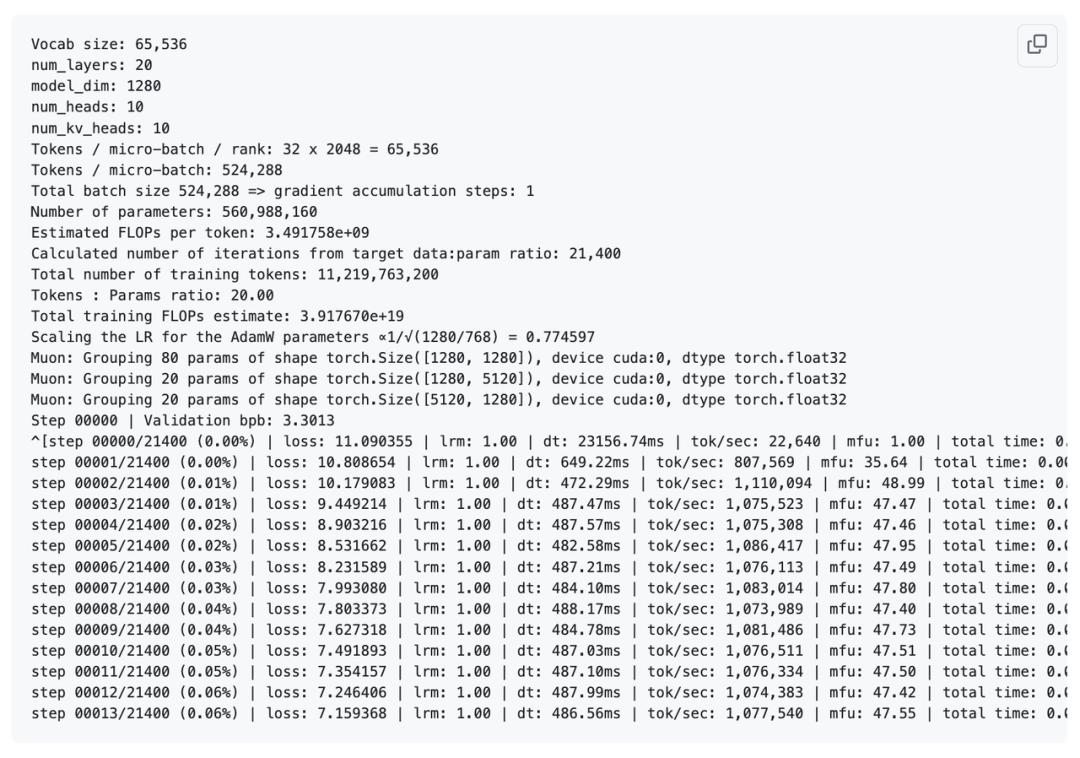 在这里,通过scripts/base_train.py脚本在8块GPU上启动训练。我们正在训练一个有20层的Transformer。默认情况下,每块GPU在每次前向/反向传播时处理32行、每行2048个tokens的数据,优化器每一步总共处理32×2048=2¹⁹=524,288≈0.5M个tokens。
