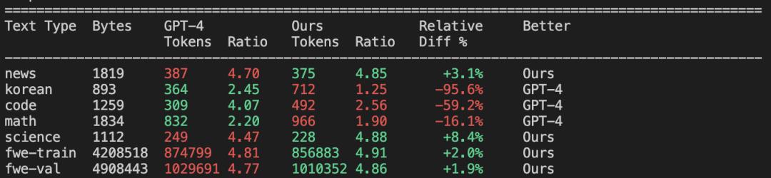 相比GPT-2(拥有50257个tokens),在压缩文本方面全面更优,仅在数学内容上稍逊一筹: