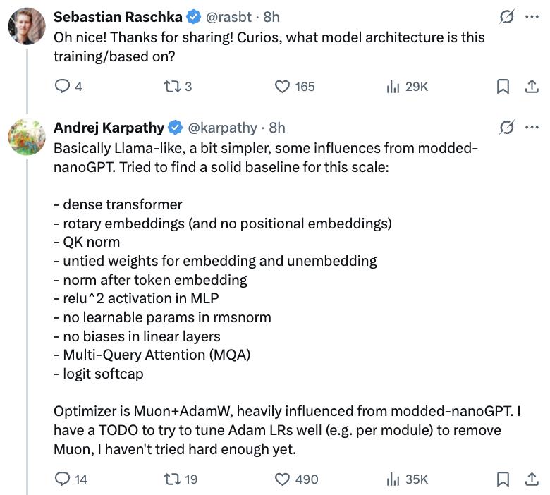 在评论区,卡帕西还解释了nanochat基本架构与Llama类似,但更简化一些,也借鉴了部分modded-nanoGPT的设计,整体是为此规模的模型找到一个稳健的基础架构。