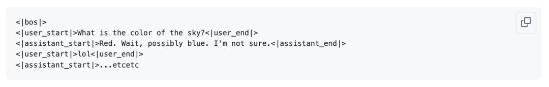算法层面和预训练完全一致,但数据集变成了对话内容,而且模型会去适应那些用于构建多轮对话结构的新特殊token。现在,每次对话大致是这样的,大致遵循OpenAI的Harmony聊天格式: