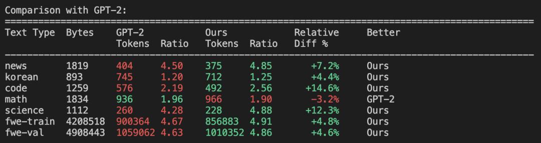 评估结果显示,实现了约4.8的压缩比(即原始文本中平均4.8个字符压缩为1个token),还可以看到与GPT-2、GPT-4分词器的对比结果。