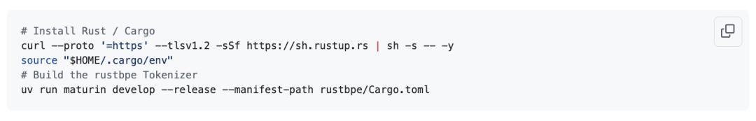 接下来,需要安装Rust/Cargo,以便编译自定义的Rust分词器。引入一个全新/自定义的分词器确实有点折腾,但遗憾的是,卡帕西觉得早期minbpe项目中的Python版本速度太慢,而huggingface的分词器又过于臃肿且令人困惑。