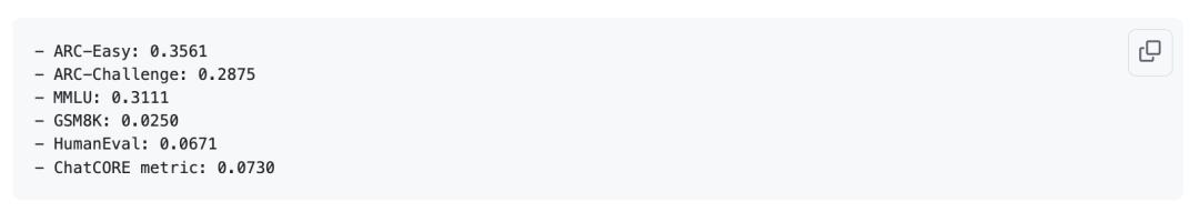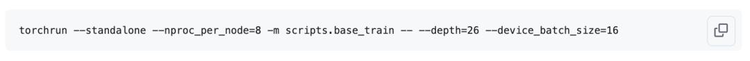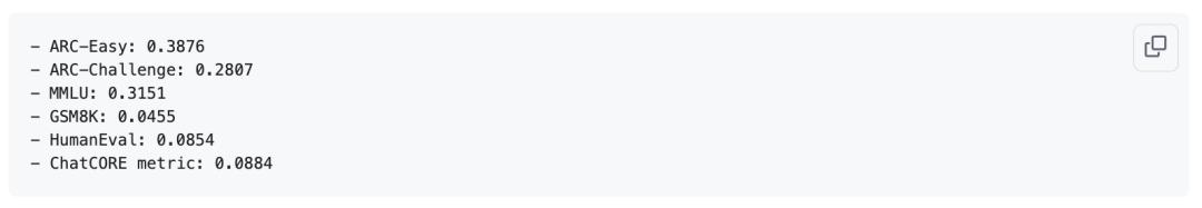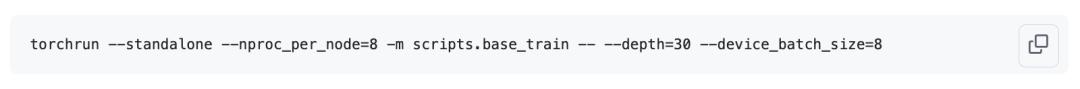 你需要在base_train.py的预训练阶段传入深度参数。例如,要得到一个CORE指标约为0.25、性能接近GPT-2的模型,尝试depth=26是个不错的选择。