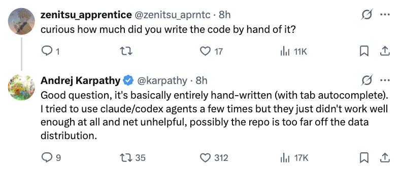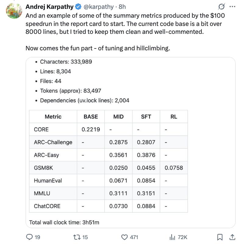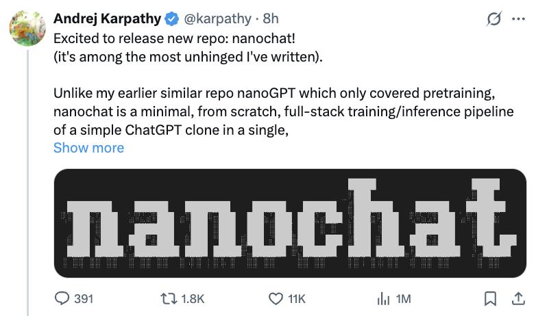 新作nanochat,被其本人称作是写得最“精神错乱”放飞自我的作品之一。