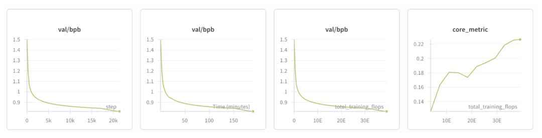 现在,要等待大约3小时,直到4e19 FLOPs的计算量完成……在你的wandb图表中,你应该会看到类似这样的内容: