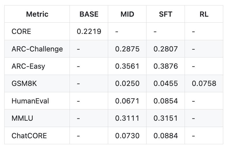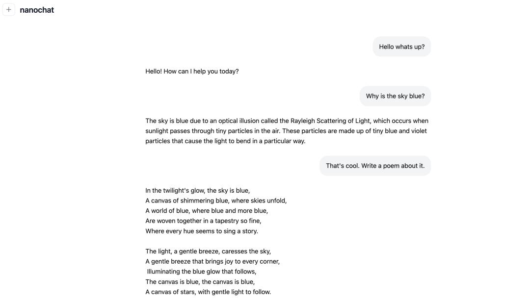 整体成本只需约100美元(在8×H100上训练4小时),就能训练复刻出一个可进行基础对话、创作故事诗歌、回答简单问题的简易版ChatGPT模型。