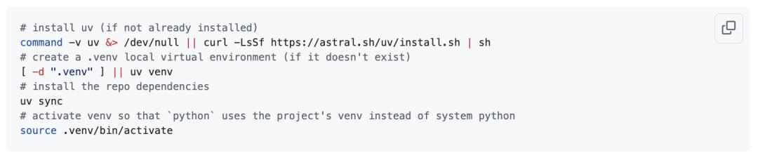 首先需要确保安装了当下热门的uv项目管理器。安装uv,在.venv目录下创建一个新的虚拟环境,获取所有依赖项,然后激活该环境,这样当输入python时,使用的是虚拟环境中的Python,而不是系统自带的Python: