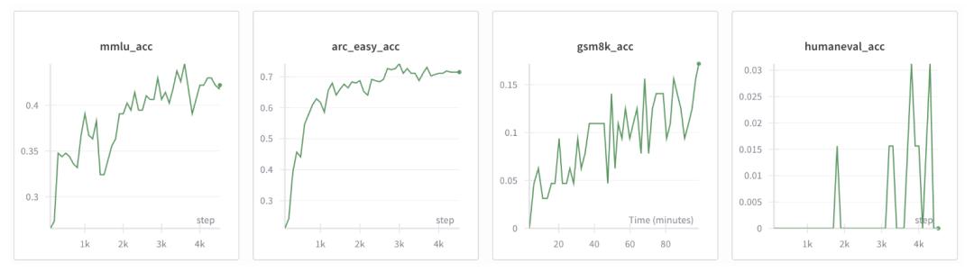 确实没有一个很好的图表来展示这一步,但这里有一个之前对另一个更大的模型进行中期训练的例子,只是为了让你了解在微调运行期间这些指标上升时的样子: