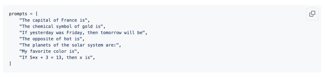 此时,这个模型就像一个高级的自动补全工具,所以我们可以运行一些提示词,来感受模型中存储的知识。base_loss.py文件会运行这些提示词。这些提示词包括: