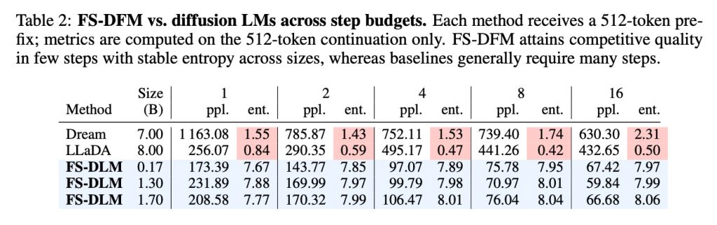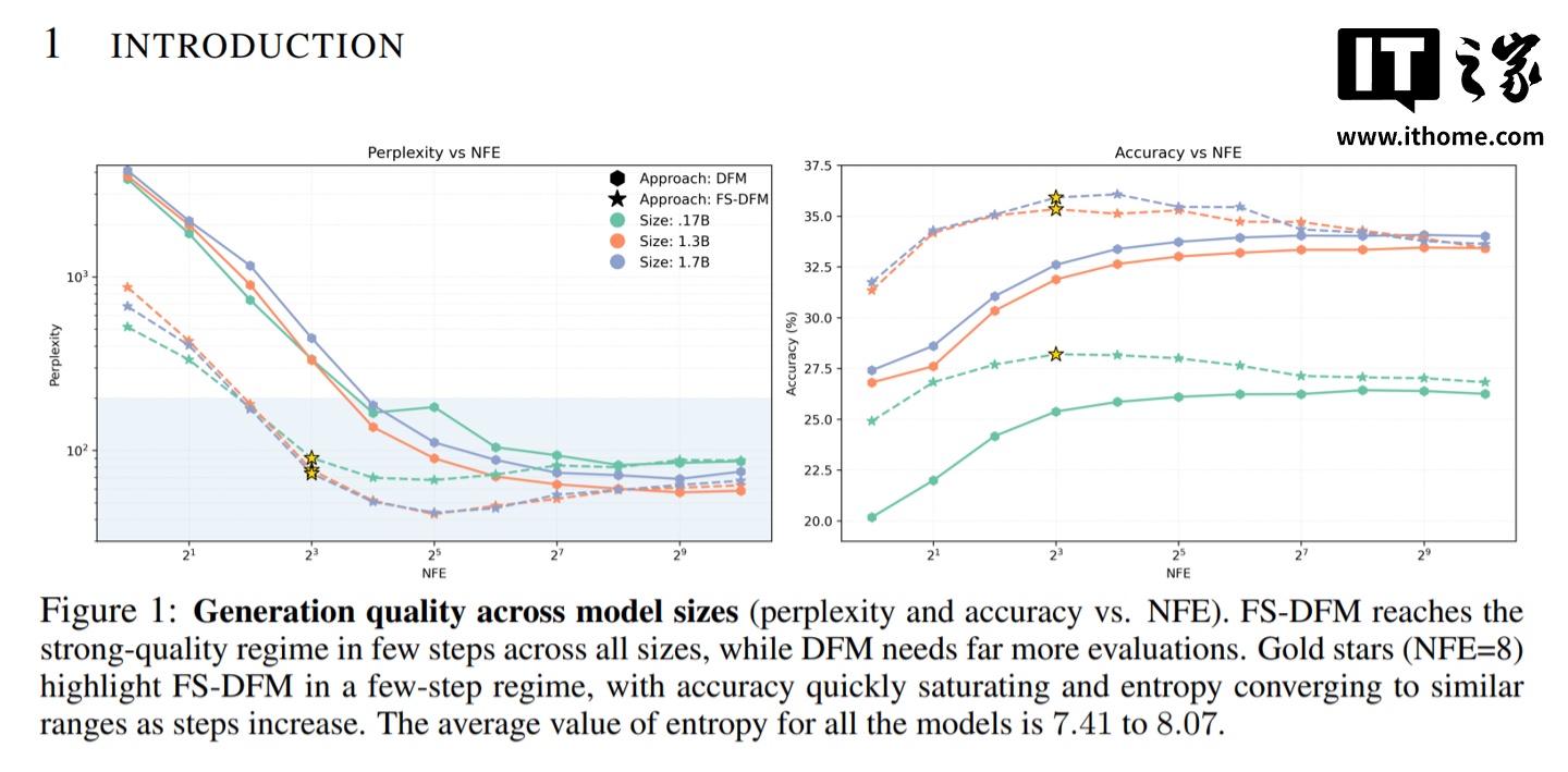 在性能评估中,FS-DFM 还支持对比了拥有 70 亿参数的 Dream 模型和 80 亿参数的 LLaDA 模型。测试结果显示,即使是参数量仅为 1.7 亿至 17 亿的 FS-DFM 变体,在困惑度(衡量文本准确与流畅性的指标,越低越好)和熵(衡量模型选词置信度的指标。熵太低,生成的文本可能单调重复;熵太高,则可能胡言乱语)两项关键数据上,都表现出更低的困惑度和更稳定的熵。