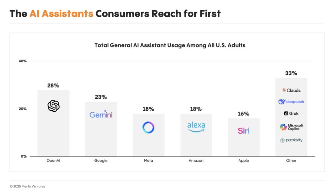 根据调研机构Menlo的数据显示,美国有四分之一的用户会选择ChatGPT作为首要入口。目前整个市场竞争非常激烈,OpenAI虽然处于领先地位,但优势并不算大。关于竞争入口的重要性,Menlo在报告中提到,“消费者几乎总是会首先尝试他们的默认工具。”