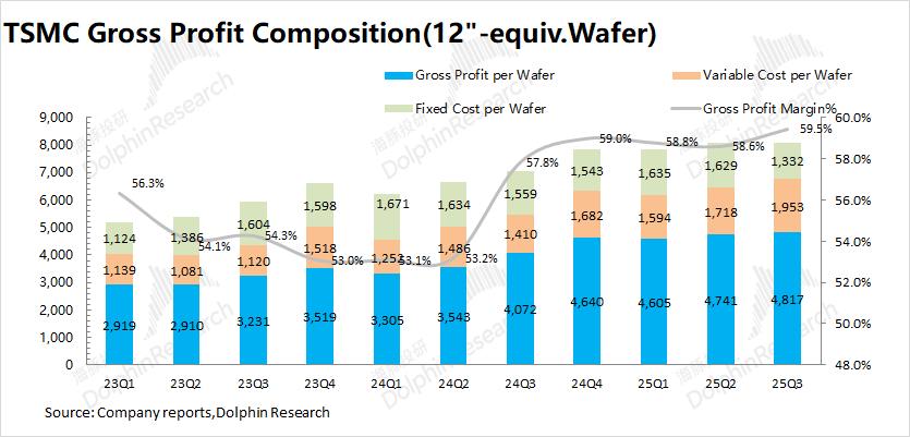 综合以上拆分,本季度台积电单片毛利4817美元/片,环比增加76美元。公司产品均价略有上升,单位固定成本的减少比单位可变成本的增加量更多,导致公司产品单位成本的下降,是毛利率环比提升的主要因素。