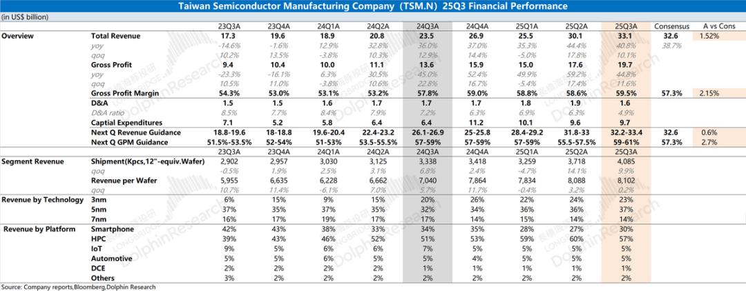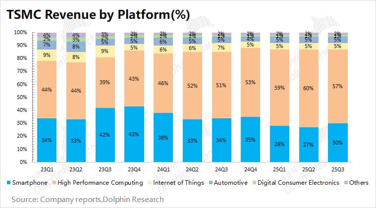 - b.下游应用端:公司本季度收入环增的主要来自于机业务,其中iPhone新机备货是主推力。受英伟达、博通等AI芯片需求的带动,高性能计算依然是公司最大的收入来源,本季度达到189亿美元,收入占比57%。