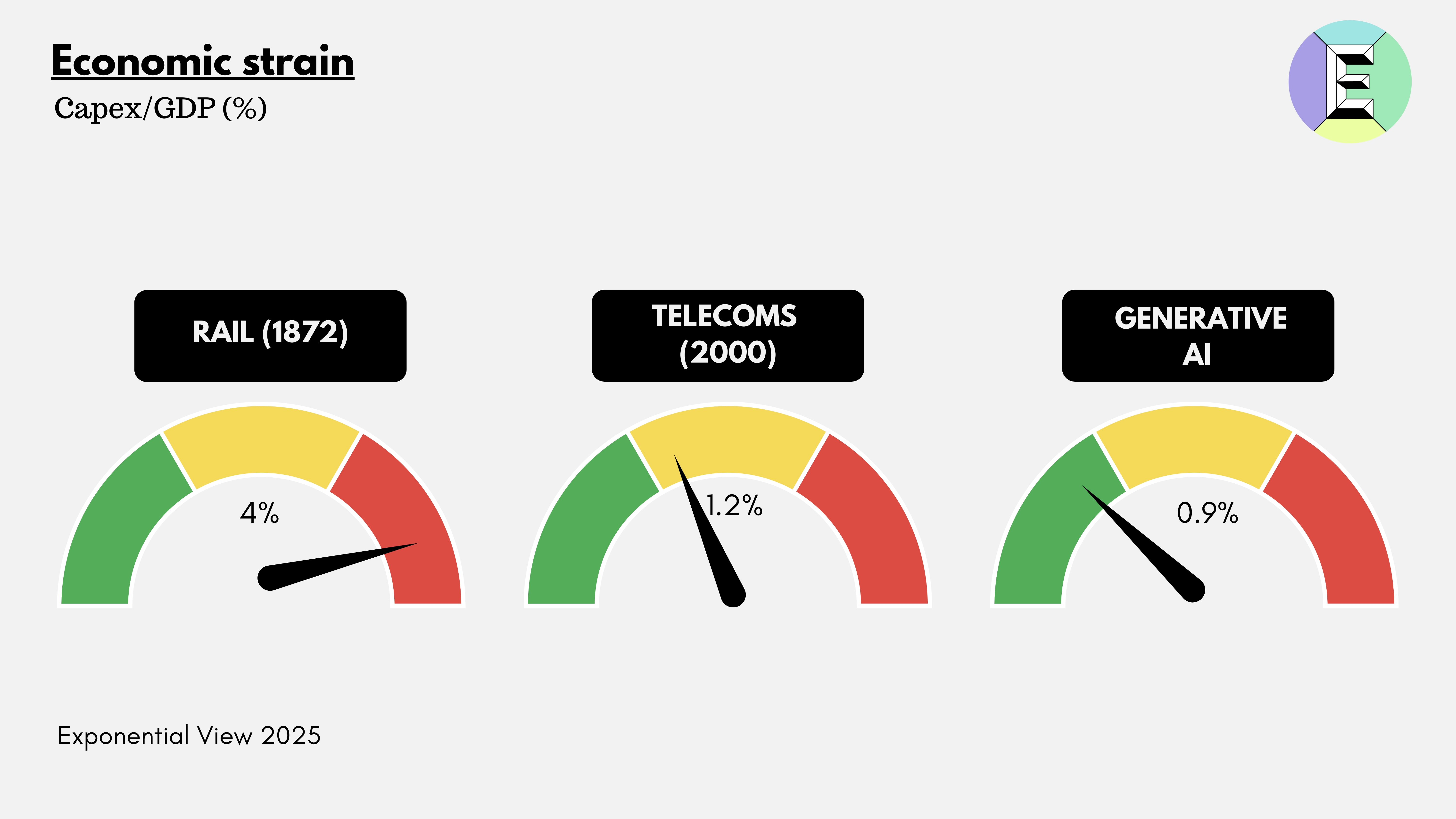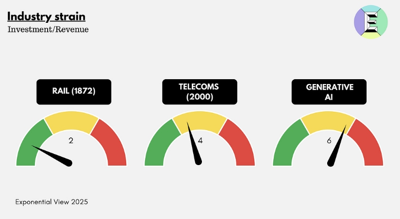在1872年美国铁路扩张的高峰期,资本支出约为收入的两倍。1990年代末爆发电信泡沫时,资本支出略低于收入的四倍。相比之下,当今的生成式AI热潮,收入约为600亿美元,而全球数据中心资本支出约为3700亿美元——资本支出与收入之比为六倍,是最为紧张的一次。