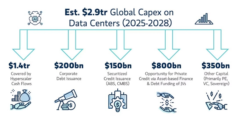 在这方面,今天的人工智能热潮看起来更为稳固。微软、亚马逊、Alphabet、Meta和英伟达正在创造惊人的现金流,足以轻松资助自身的建设。但目前只是如此。投资需求正在飞速增长。摩根士丹利估计,2025年至2028年间,全球数据中心总资本支出将达到2.9万亿美元。超大规模云服务商或许能用内部现金覆盖其中的一半。其余的必须来自私人信贷、证券化融资和新的运营商。各国政府也已承诺进行1.6万亿美元的主权AI投资,海湾资本也正在寻找新的机会。