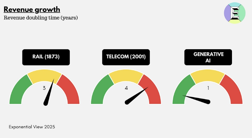 如今,情况要平静得多。纳斯达克的市盈率约为32,是互联网时代的一半。更广泛的科技市场估值高于长期平均水平,但远未达到互联网泡沫的程度。与铁路泡沫时期估计约20的市盈率相比,现在的估值偏高。但铁路泡沫的结局很糟,不是因为估值本身极端,而是因为收入增长停滞。相比之下,生成式AI的收入仍在快速加速增长。