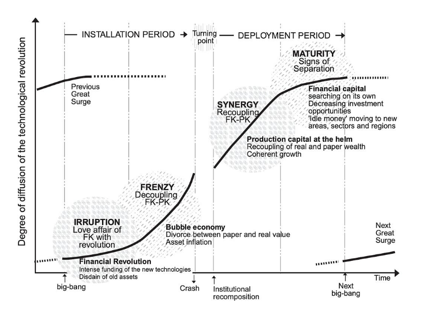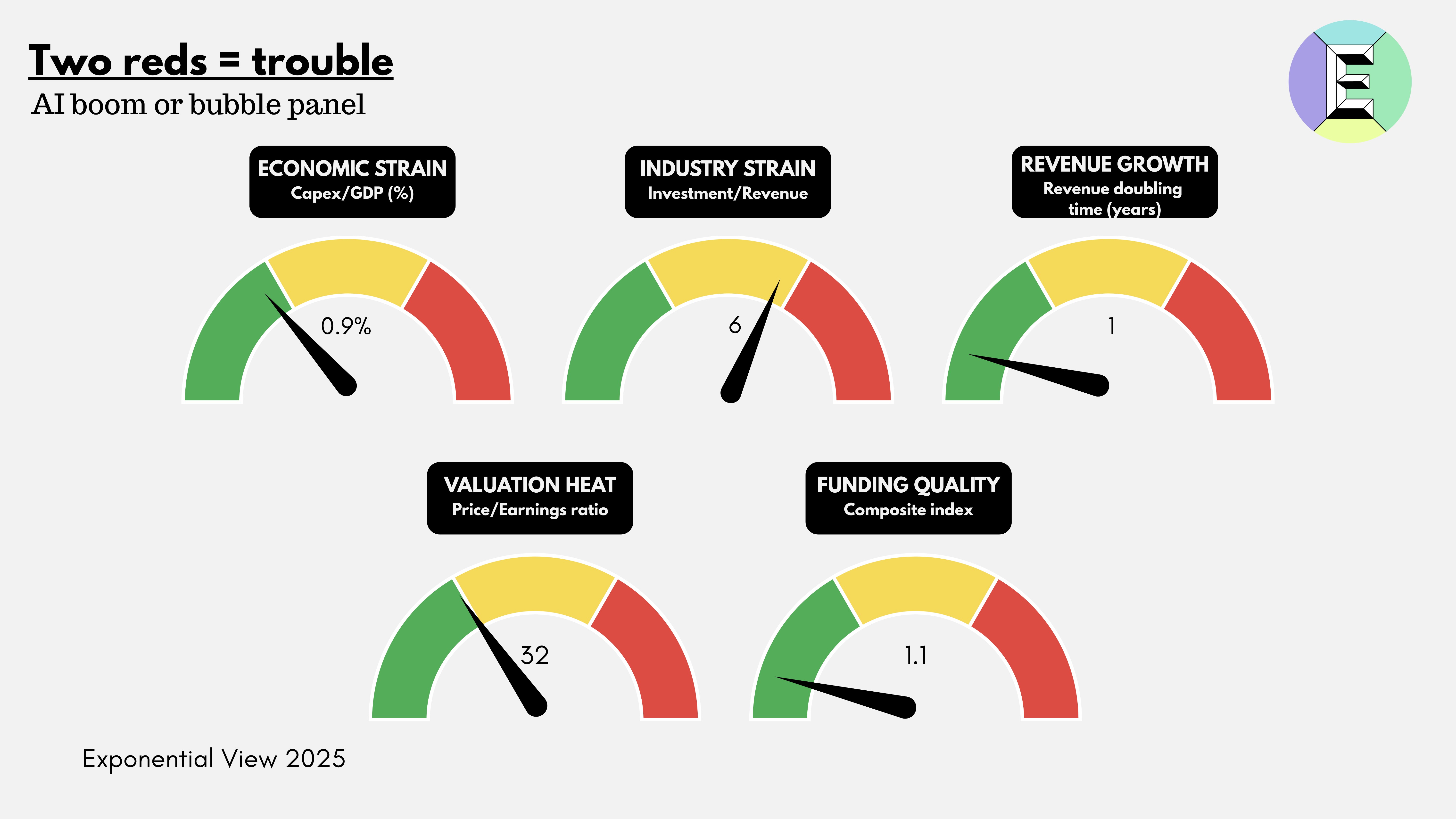 我的思考基于卡洛塔·佩雷斯(Carlota Perez)、比尔·詹韦(Bill Janeway)等领域巨擘的研究,以及各大银行和分析师的金融分析。但我还没在别处见过一个能将这些理论转化为当今人工智能实用仪表盘的框架:一组可阅读、可与过往泡沫进行比较并用以指导决策的参数。