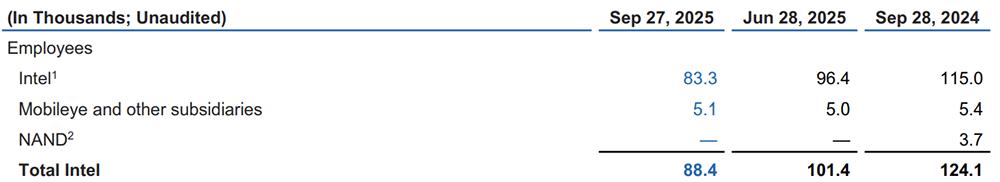 英特尔还披露了近期裁员的规模。该公司在第三季度继续推行激进的成本削减计划,将员工数量减少了13%,从第二季度的101,400人减少到88,400人(减少1.3万人),包括子公司在内的公司总员工人数同比减少29%。