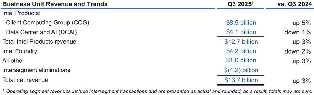 英特尔产品收入为127亿美元,同比增长3%。其中客户端计算业务营收为85亿美元,同比增长5%;数据中心与人工智能业务营收为41亿美元,同比减少1%。