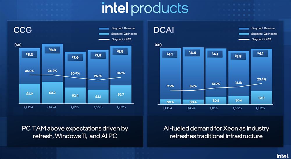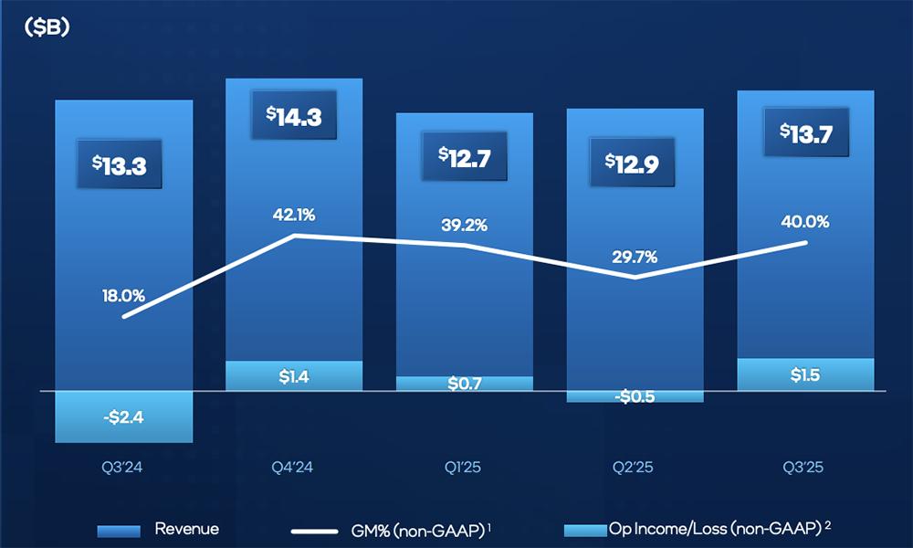 总体来看,英特尔第三季度营收为137亿美元,同比增长3%,Non-GAAP毛利率提升到40%,运营现金流为25亿美元。