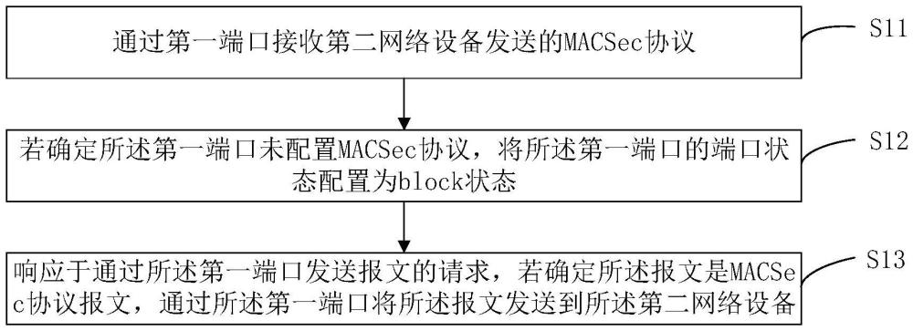 本公开提出一种报文传输方法、芯片、网络系统及电子设备,涉及通信技术领域。该方法包括:第一网络设备通过第一端口接收第二网络设备发送的MACSec协议,第二网络设备是和第一网络设备建立物理连接的网络设备;若确定所述第一端口未配置MACSec协议,将所述第一端口的端口状态配置为阻塞block状态;响应于通过所述第一端口发送报文的请求,若确定所述报文是MACSec协议报文,通过所述第一端口将所述报文发送到所述第二网络设备,所述MACSec协议报文是指符合MACSec协议但不包含MACSec安全标签的报文。本公开实施例,通过将未配置MACSec协议的第一端口配置为block状态,能够在确保MACSec协议报文可以被有效传输的情况下,有效的阻止业务报文的转发,从而有利于改善业务报文丢失的情况。