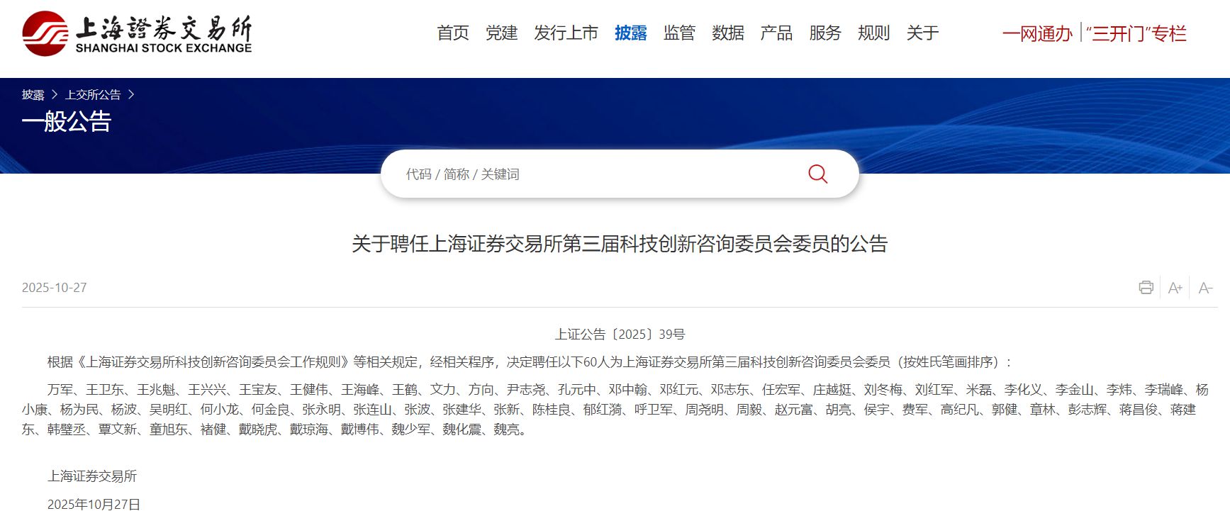 上交所发布消息显示,第三届咨询委由60名委员组成,主要来自科研院所、链主企业、国家部委机关等,以连任委员为主,同时增补人工智能、机器人、商业航天、低空经济等未来产业领域专家,委员来源分布广泛,具有较强的代表性。咨询委委员将按照《上海证券交易所科技创新咨询委员会工作规则》要求,以个人专家身份兼职参与咨询委工作,主要就发行上市审核工作中的企业科创属性、业务与技术相关事项等提供咨询意见,为上交所板块建设和相关规则制定提供政策建议。