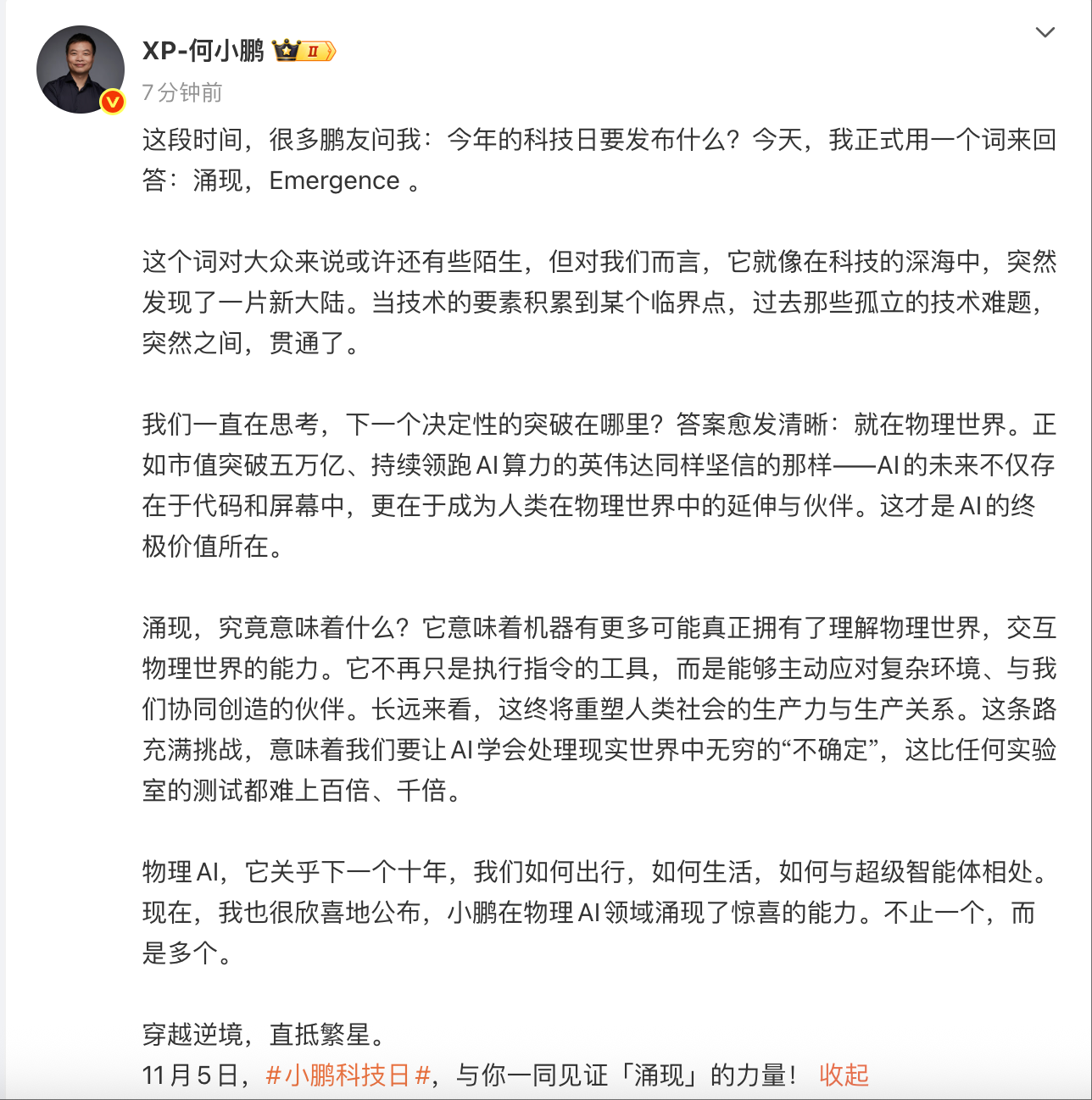凤凰网科技讯 10月30日,2025小鹏科技日将于11月5日15:30在广州举行。今年的科技日要发布什么?何小鹏发文称,用一个词来回答:涌现,Emergence。