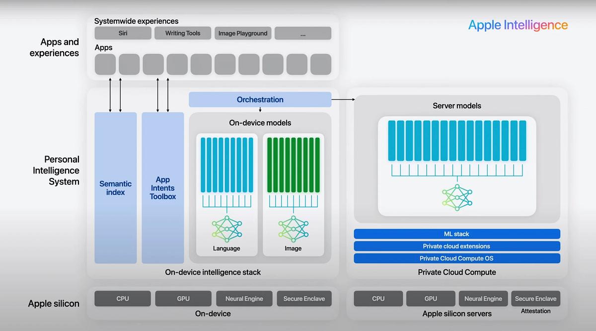 今年 7 月,苹果机器学习研究团队发布了一份技术报告,披露了苹果的两类自研模型。首先就是那套约 30 亿参数的端侧模型,针对KV-cache 共享、量化感知训练等进行了优化;其次就是去年底就透露出的百亿级参数云端大模型,采用了目前主流的 Mixture of Experts(MoE)架构,计划将多专家路径与苹果的 PCC 私有云计算服务器深度结合,以提升推理效率与隐私安全。