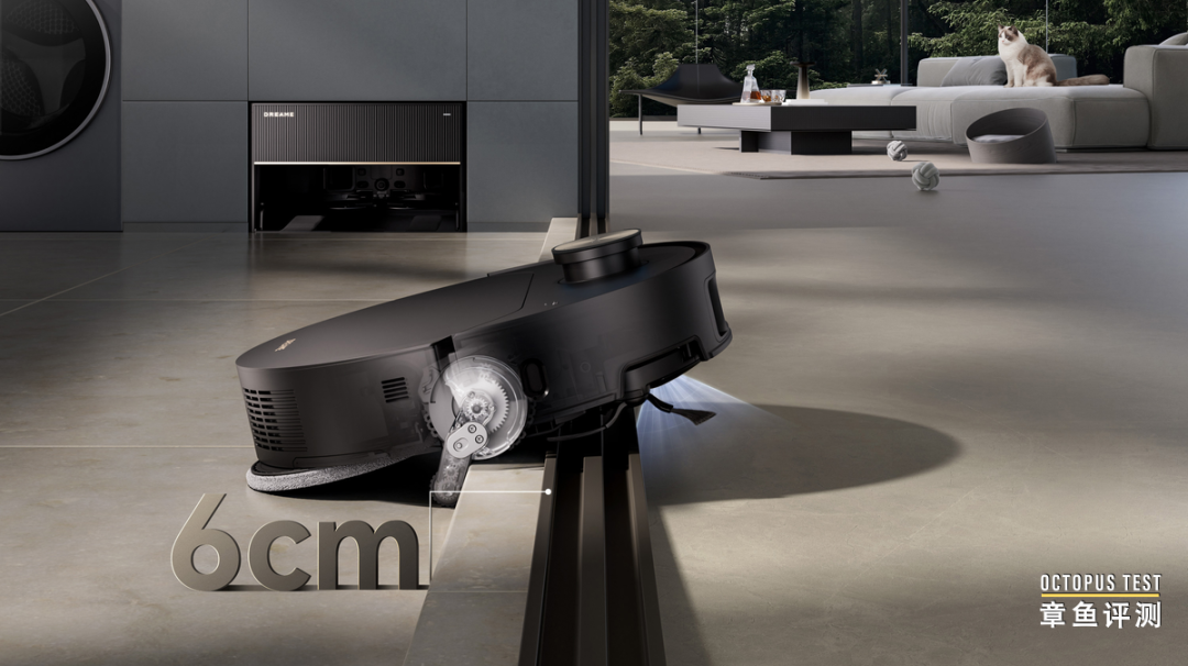 集成了履带式电动摇臂,可以让你的扫地机器人具有更好的通过能力,甚至可以爬楼。X50 Ultra 的另一个亮点在于潜望式 360° 升降雷达,雷达升起,更高效地扫描并绘制家庭环境,配合 AI 加持的摄像头,精准识别电源线、拖鞋等地面物品,而在雷达藏于机身内时,整机高度只有 89 毫米,可以潜入类如茶几、电视柜等低矮区域清洁作业,进一步消除扫地机器人的死角。