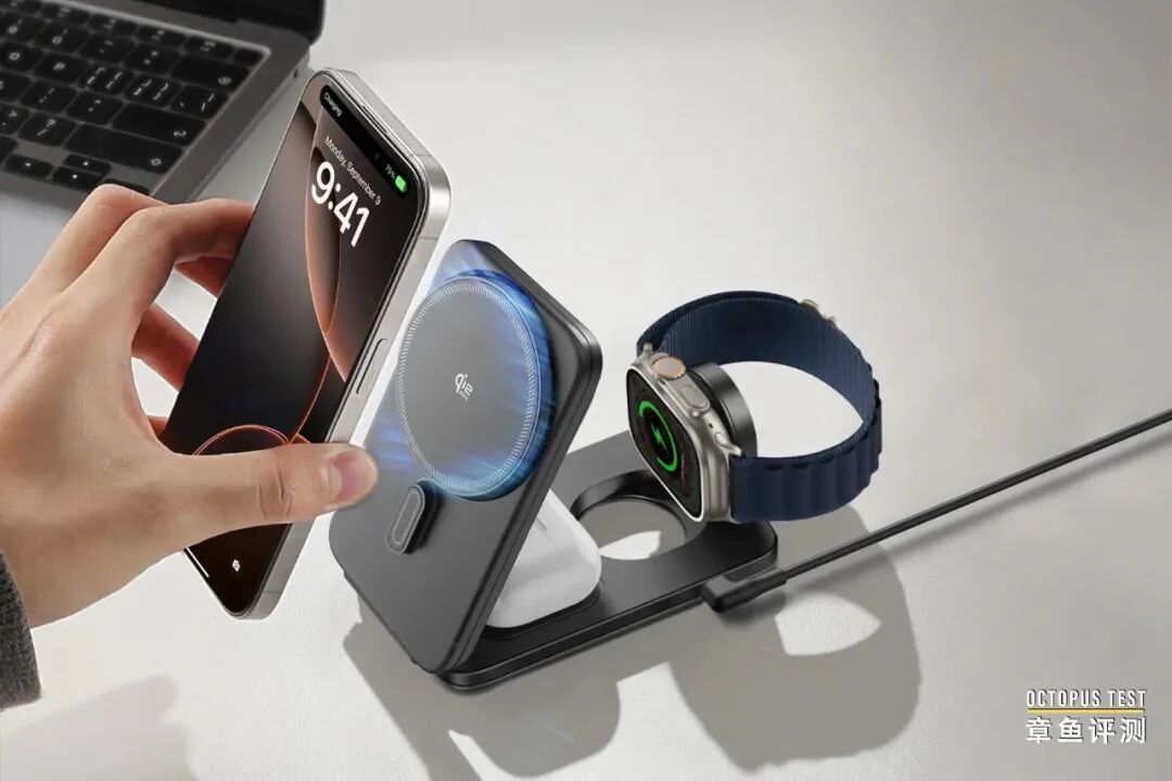 这款适用于 iPhone、Apple Watch 和 AirPods 的充电支架不仅支持先进的 Qi 2.2 无线充电标准。CryoBoost 冷却技术采用开放式风道和由航空级铝材制成的静音超薄风扇来冷却设备(而不是像大多数竞争对手那样直接对着充电器吹风);与非 CryoBoost 技术的 Qi 2.2 产品相比,它能使设备温度降低 4 摄氏度,从而更快地为电池充电。它为 iPhone 16 Pro 充电的速度比竞争对手快半小时。