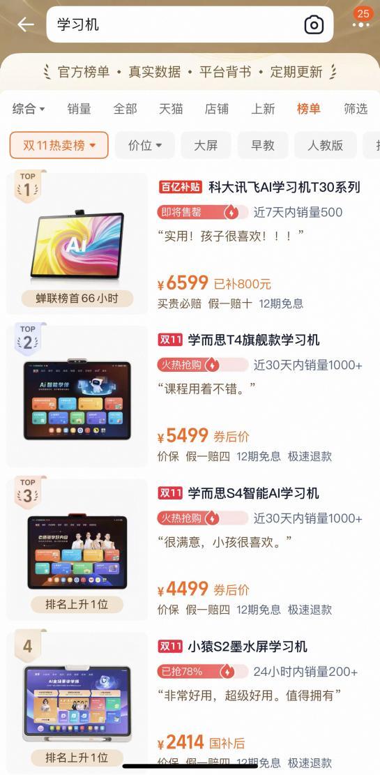 淘宝学习机品类双11热卖榜,学而思和科大讯飞旗下的学习机占据前三甲。