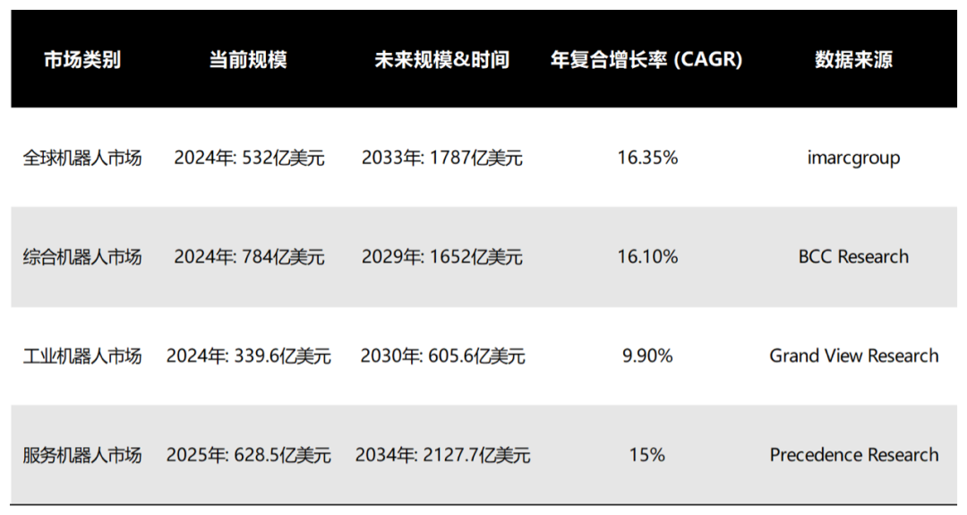 从行业潜力看,速腾聚创CEO邱纯潮公开表示,机器人是10倍于汽车市场的应用场景。全球多家机构指出,综合机器人、工业机器人、服务机器人市场规模均呈快速增长之势。Imarc Group预测,2033年全球机器人市场规模将达到1787亿美元。