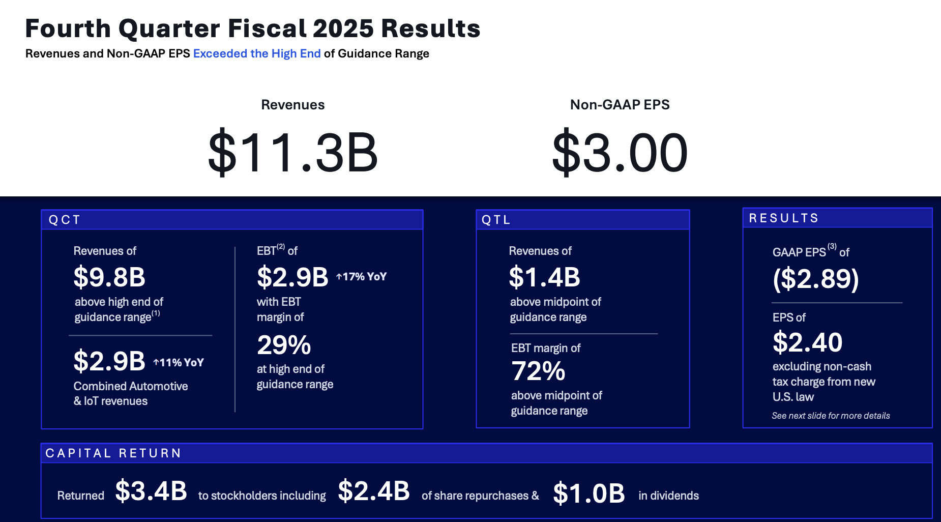 季度营收连续五个季度破百亿美元,年度营收破400亿美元,汽车业务营收创纪录……得益于支柱业务和新兴业务的全面超预期增长,日前,高通公布的Q4(9月季度)以及25财年年报交出一份亮眼成绩单。