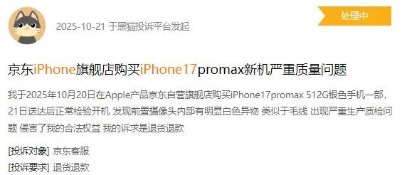 比如,有网友在黑猫投诉平台投诉称,其在Apple京东自营旗舰店购买的iPhone 17promax版手机,正常开机发现前置摄像头内部有明显白色异物,怀疑“出现严重生产质检问题”。