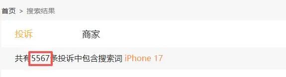 「TMT星球」又以“iPhone 17”为关键词在黑猫投诉平台进行检索,结果显示,相关投诉量高达5567条,主要集中在产品有质量瑕疵、货不对板、超期不发货、售后服务差等方面。