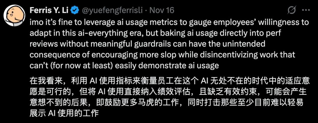也有网友表示,这个想法是好的,但直接强硬地将AI使用塞入绩效指标,可能适得其反: