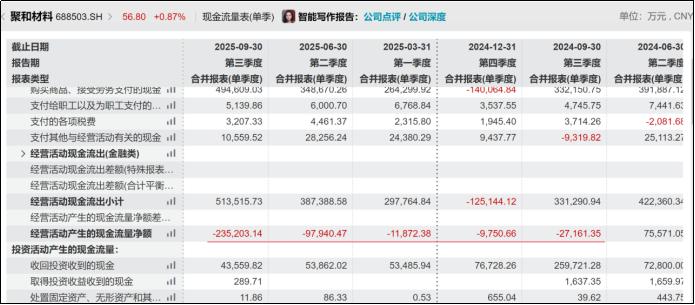 华夏能源网注意到,聚和材料近三年债务激增。截至目前,公司总负债已达69.84亿元,相比2022年翻了四倍多;资产负债率也从2022年的21.75%猛涨至当前的59.07%。并且,受银浆行业客户67天长付款周期、原材料囤货以及技术迭代期战略备货等影响,公司运营资本大幅增加。今年前三季度,公司经营活动产生的现金流量净额合计-34.5亿元。