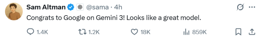 在LMArena排行榜上,Gemini 3 Pro以1501的Elo分数登顶,这是AI模型在综合能力评估中的新纪录。这是一个相当优秀的成绩,就连奥特曼也发推表示祝贺。