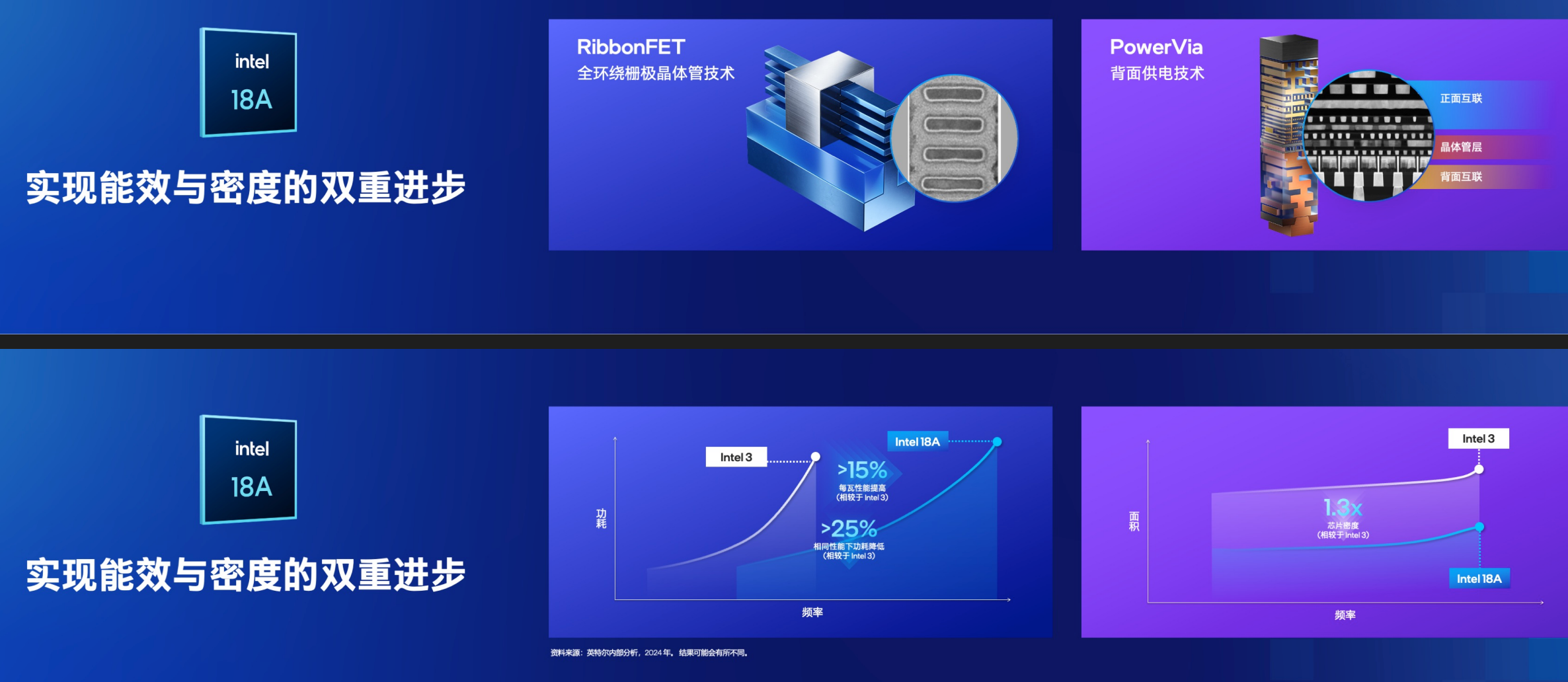 高嵩介绍,与上一代制程相比,有了RibbonFET和PowerVia技术加持,Intel 18在相同功耗下性能提升超过15%,在相同性能下功耗降低25%以上。晶体管密度提升了30%。在更小面积上集成更多晶体管,也为更好的成本优势创造了条件。