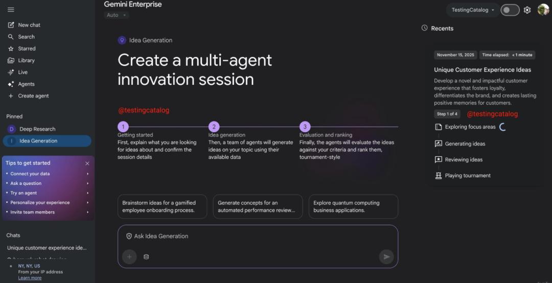 具体来看,Gemini for Enterprise的多智能体系统会首先接收主题与评估标准,大规模生成初始创意(100+)。