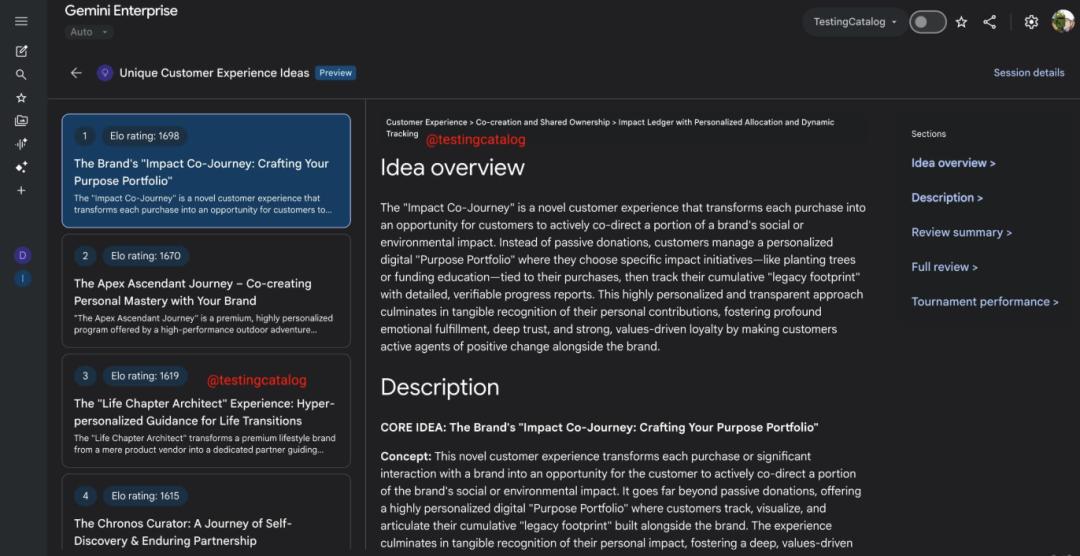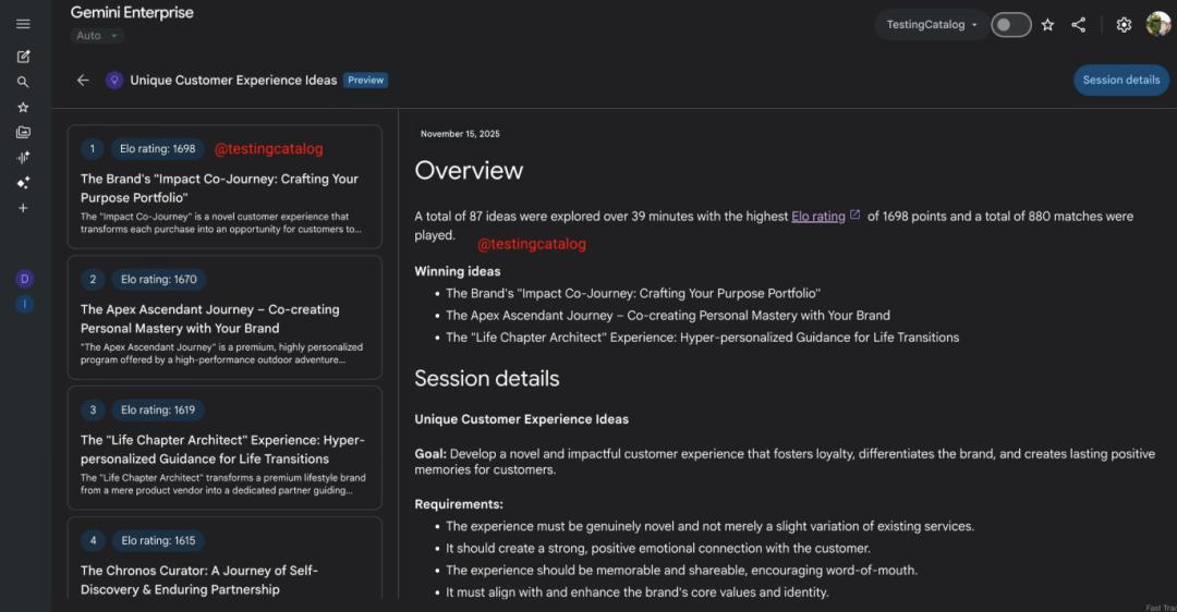 在这段时间里,Gemini能根据用户输入,自动生成100+条创意,并由一组Agent对这些创意进行打分,排名,产出结构化的评审报告。