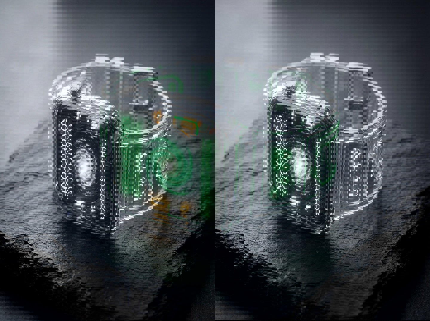 提示词:A professional studio product shot of a futuristic, transparent smart-watch resting on a piece of dark slate. The watch interface is glowing holographic green. Soft dramatic lighting, 8k resolution, macro photography style, shallow depth of field. —ar 4:3