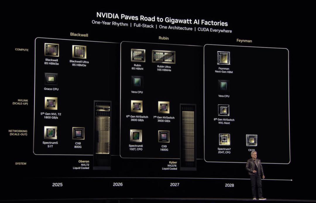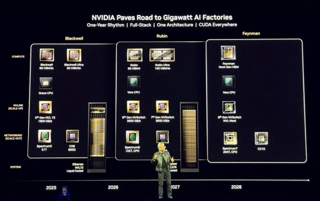 2024-2025年是Blackwell的主场,2026-2027年Rubin就要登场,2028年还有更强大的Feynman。