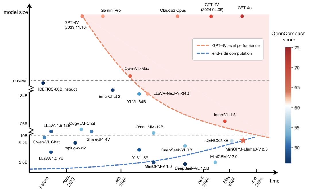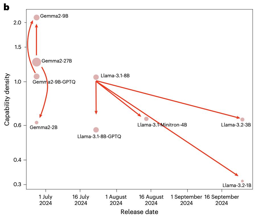 受此启发,研究团队提出:大模型发展同样可以从“能力密度”的角度来观察和理解。正如芯片行业通过提升电路密度实现了计算设备的小型化和普惠化,大模型也在通过提升能力密度实现高效化发展。