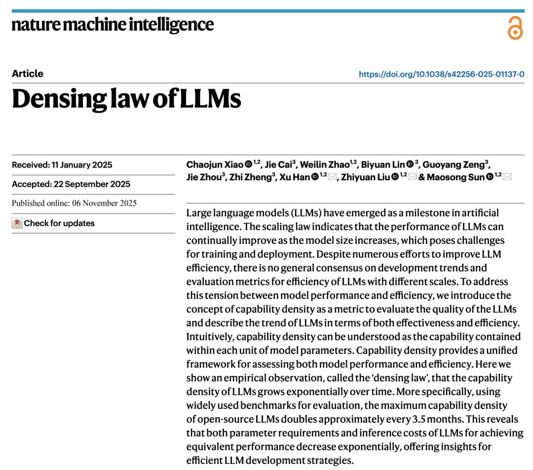 清华大学研究成果大模型“密度法则”(Densing Law) 给出了新的观察视角。近日,该成果正式发表于 Nature 子刊《自然·机器智能》(Nature Machine Intelligence),为理解大模型发展规律提供了新的维度。密度法则揭示了大语言模型的最大能力密度随时间呈指数级增长,2023 年 2 月至 2025 年 4 月,约每 3.5 个月翻一倍,这意味着每隔 3.5 个月,即可用一半参数量的模型实现当前最优性能。
