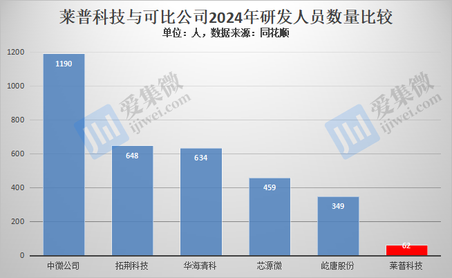 另外,报告期各期,莱普科技员工总数分别为127人、202人、277人、310人,对应的研发人数占比分别为20.47%、15.84%、22.38%、27.74%,与可比公司相比,其研发人员比重同样垫底。