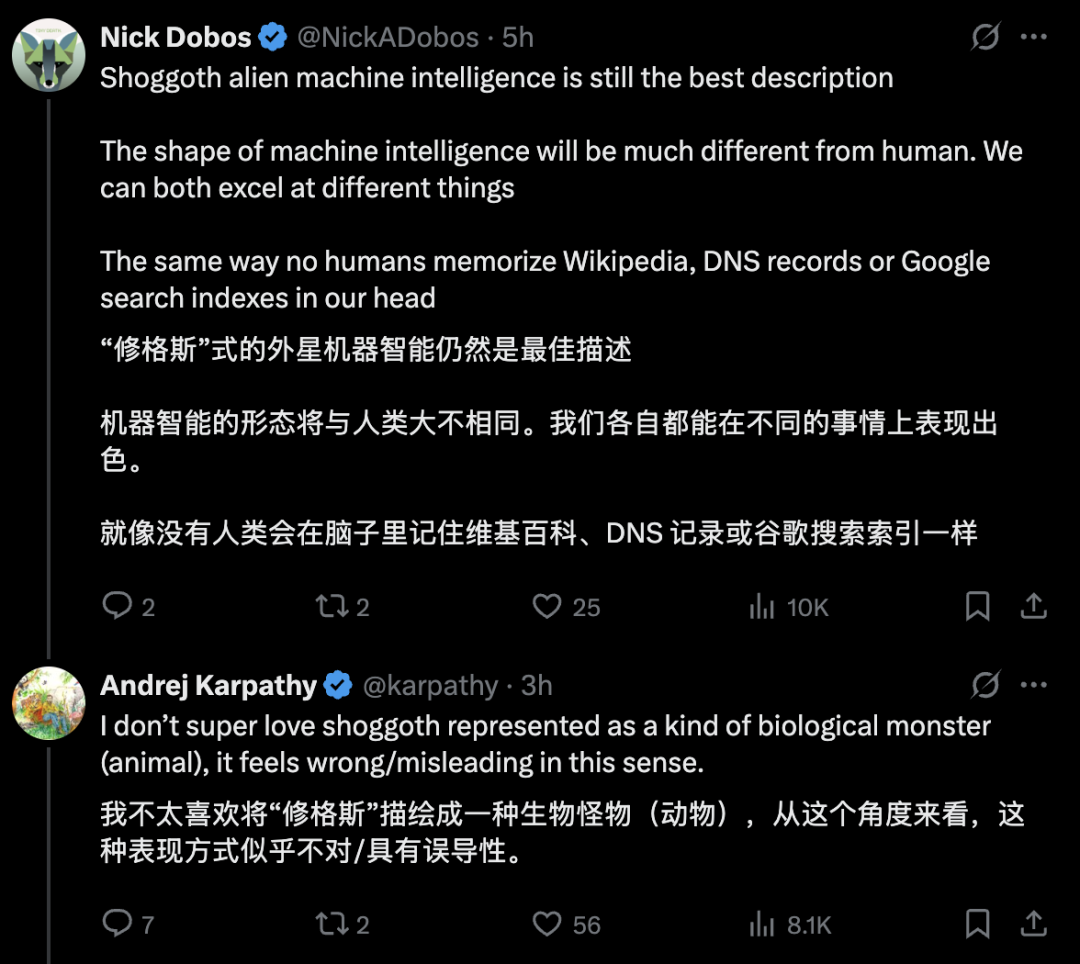 Karpathy 则回复表示,将「修格斯」描绘成动物可能会有误导性。看来,他非常警惕所有将 AI 与动物智能联系起来的说法。