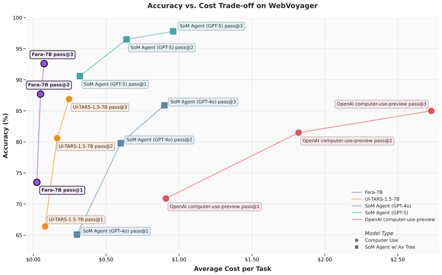 在测试中,Fara-7B 在多项公开基准(WebVoyager、Online-Mind2Web、Deepshop)以及微软新公布的 WebTailBench 中表现亮眼,在部分任务中领先同级模型 UI-TARS-1.5-7B,并可与更大规模、通过复杂提示方式驱动的系统(如使用 Set-Of-Marks 的 GPT-4o)竞争。