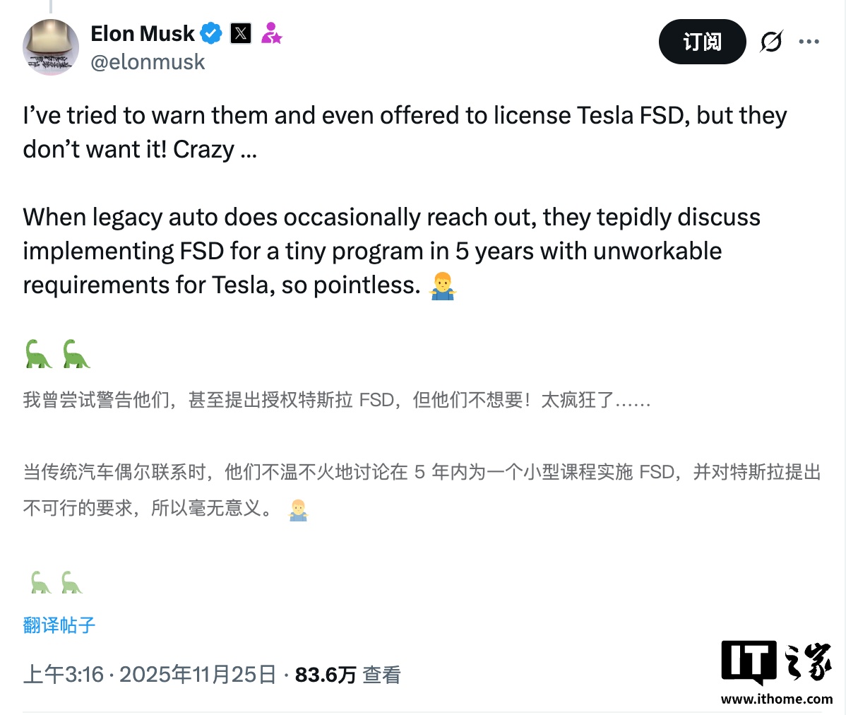 IT之家 11 月 25 日消息,马斯克曾表示,其他汽车制造商将授权使用特斯拉的全自动驾驶(FSD)系统,然而截至目前,没有任何汽车制造商愿意采用这一技术。“他们(指车企)不想要!”