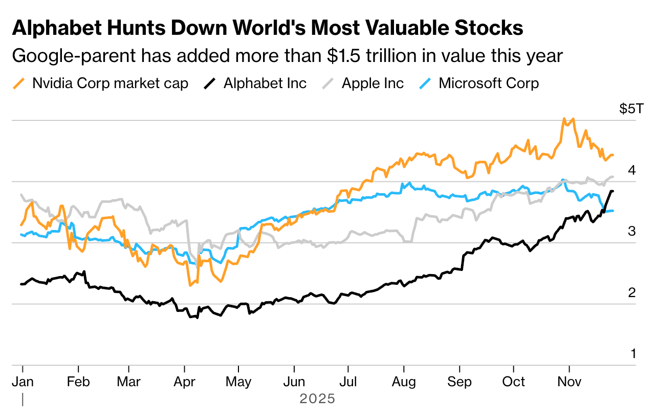 谷歌最新Gemini 3大模型备受好评,其AI芯片也展现出市场需求,这推动该公司股价走高,促使投资者正在重新评估科技行业格局以及股市领头羊可能发生的变化。